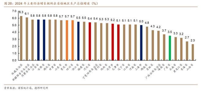 多个经济增长极积势成型并对全国经济形成有效支撑。我国国土空间广阔、经济体量庞大,单一“雁头”带动模式易引发诸多弊端,培育多个增长极并推进协同发展,才能产生更强的规模效应和集聚效应,推动全国经济实现持续健康发展。2024年长三角(上海、江苏、浙江、安徽)GDP合计33.17万亿元,全国占比24.7%;粤港澳大湾区(仅广东)GDP达14.16万亿元,全国占比10.6%;京津冀(北京、天津、河北)GDP达11.54万亿元,全国占比8.6%;成渝(四川、重庆)GDP达9.69万亿元,全国占比7.2%。上述四大经济增长极GDP全国占比高达51.2%,成为支撑我国经济增长的关键力量,并对周边地区和省份的经济社会发展形成显著辐射带动。