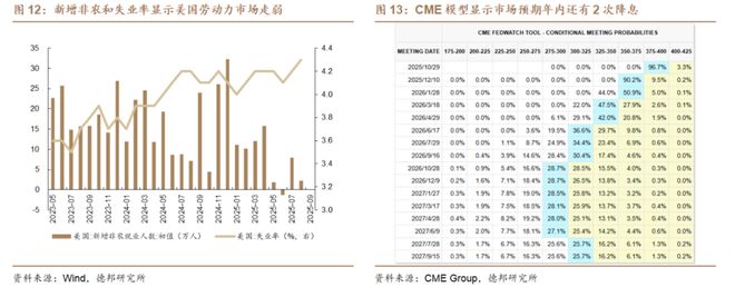另一方面,美联储的政策转向成为美元走弱的直接推动力。2025年9月,美联储在就业增速放缓的背景下再度开启降息,虽然鲍威尔的讲话偏鹰,更加强调就业与通胀间的平衡,并未释放连续降息的信号,但市场目前仍预期年内还有2次降息。从货币传导机制看,降息意味着美元收益率优势下降。过去几年美元走强的重要支撑之一正是美债利率吸引全球资本流入美元资产,随着利差收窄,投资者可能会重新评估美元资产的风险收益比。