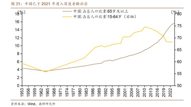从“十四五”时期看,中国人口出现了历史性拐点。虽然在全面二孩政策实施初期(2016—2017年),我国出生人口出现过短暂抬升,一度超过1700万,但随后生育意愿持续下滑、育龄女性减少、婚育推迟明显,人口出生规模开始下降。中国自2021年正式进入深度老龄化社会,到了2023年,全国出生人口降至902万,较2016年几乎减半,创历史新低。随着“60后”、“70后”群体陆续步入退休高峰期,65岁及以上人口占比将在“十五五”期间将继续上升;劳动年龄人口(15-64岁)占比则持续下降,劳动力供给约束日益突出。这一变化既会抬升用工成本、压低潜在经济增速,也将推动资本与技术投入回报上升,促进产业自动化与智能化转型,从而孕育新的生产率红利。与此同时,老龄化社会的到来也催生了庞大的“银发经济”,老年群体消费结构从基本保障型向品质提升转变,带动医疗健康、长期护理、康养地产、文旅休闲、养老金融等产业快速成长,成为新的增长动能。