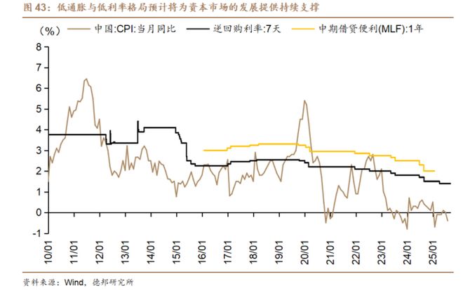 二是从宏观层面看,低通胀、低利率与流动性合理充裕的金融环境预计成为支撑这一趋势的重要基础。我们认为,“十五五”时期,中国经济运行的主要特征之一,将是物价温和、利率低位、流动性充裕的中长期金融格局。通胀水平预计将维持在合理区间内,既不会形成系统性通胀压力,也不至于陷入通缩区间,为政策调控留出充足的空间。温和的通胀意味着居民储蓄的实际回报有限,从而弱化传统存款的吸引力,使得家庭资产配置的重点逐步从“保值”转向“增值”。与此同时,货币环境预计将维持中性偏松,即在稳健基调下保持对实体经济和资本市场的合理支持。政策层面,央行更可能通过结构性工具与市场化利率机制,维持资金面的合理宽松,以促进投资和消费修复。低利率结构不仅降低了企业融资成本,提升了投资回报的可预期性,也在估值端抬升了资本市场的相对吸引力。当无风险利率长期处于低位时,资产定价体系的重心自然上移,权益类资产与长期投资品种(如REITs、养老金产品等)在居民配置中的比重将逐步上升。