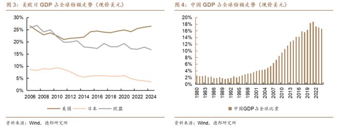 若从购买力平价角度看,可以得出更明显的结论。早在1999年,中国按购买力平价计算的全球GDP占比已经超过日本,份额连续三十多年保持稳步增长,中间鲜有回落,并在2014年超越了美国,位列全球第一。按2024年购买力平价GDP数据,中国19.3%的全球占比较美国的14.8%已有显著优势,而日本仅剩3.2%的水平。按此计算,中美位列全球经济前两名且遥遥领先其他经济体。