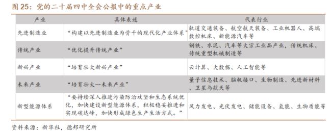 一是回顾历次规划建议可以发现,对“产业”、“制造业”、“实体经济”的重视程度正逐步增强。在“十三五”规划建议中,明确提出“加快建设制造强国,实施《中国制造二〇二五》”,以及目标要求“产业迈向中高端水平,先进制造业加快发展”;但“实体经济”更多出现在成本控制等细节中,并未成为核心表述。进入“十四五”,文件首次强调“坚持把发展经济着力点放在实体经济上,坚定不移建设制造强国、质量强国、网络强国、数字中国,推进产业基础高级化、产业链现代化”;进一步提出“保持制造业比重基本稳定,巩固壮大实体经济根基”。相比之下,“十五五”规划建议(即二十大四中全会文件)在产业方面措辞更为突出,要求“建设现代化产业体系,巩固壮大实体经济根基。坚持把发展经济的着力点放在实体经济上,坚持智能化、绿色化、融合化方向,加快建设制造强国、质量强国、航天强国、交通强国、网络强国,保持制造业合理比重,构建以先进制造业为骨干的现代化产业体系。要优化提升传统产业,培育壮大新兴产业和未来产业,促进服务业优质高效发展,构建现代化基础设施体系”。由此可见,“十五五”规划建议在政策表述中更加强调制造业和实体经济的重要性,上升到构建先进制造业为骨干的现代化产业体系的高度,体现了对产业发展的更高关注度和更强政策导向。