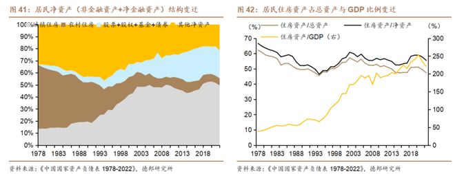 一是随着地产步入下行周期,“去地产化”也在催生“负财富效应”,未来居民财富增值的“新解”或许在以股票、债券和基金为代表的金融资产。2019年以来,居民住房资产的相对规模有所缩水,其占GDP、居民总资产、居民净资产的比例均出现下行。截至2022年,三者较2019年高点分别回落19.0、3.7、3.4个百分点。与此同时,非金融资产占比的下降对应着金融资产占比的上升。在金融资产内部,截至2022年,如果考虑股票、股权、债券和基金四类资产,相比2019年而言,我们发现它们在总资产中的占比也有所下行。然而,考虑到居民部门的“股权”资产主要对应于非上市公司净资产的私人部分,因此高度集中于少数投资人或企业主手中,如果予以剔除,将股票、债券和基金这三类普通投资者容易接触到的金融资产合并考虑,可以发现它们在总资产中的比重有所提升,2022年占比为14.1%。虽然从绝对数值上看,这几类金融资产在居民总资产的占比还远远比不上住房资产,但其未来的成长空间无疑是巨大的。