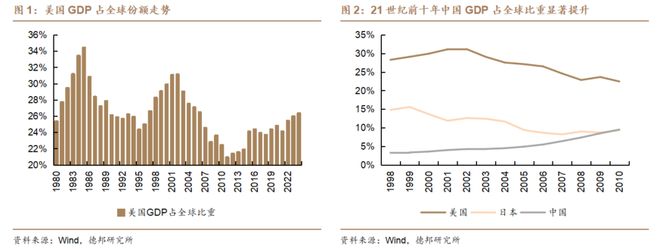 随着2001年中国加入WTO,经济全球化开始加速,中国经济实现腾飞。随着美、日在全球经济份额的回落,中国全球经济份额在21世纪前八年实现翻番,从2000年的3.6%稳步提升至2008年的7.4%,距离当时日本的9.0%已不遥远,并在强大的惯性下,2010年顺利完成对日本的赶超。