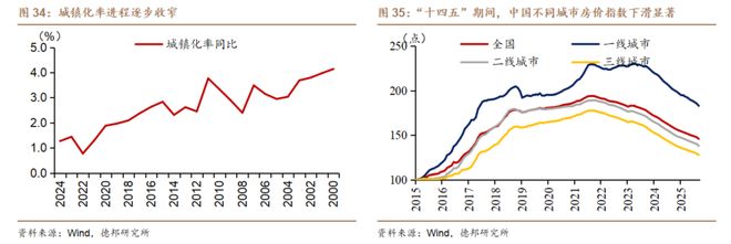 一线城市的房价收入比虽仍高于中小城市,但也出现了显著下降的迹象。例如,北京、上海等一线城市在2021、2022年的房价收入比高达50倍左右,而最新数据显示,北京和上海也降至37倍左右的水平。随着近几年一线城市房价回落,叠加居民收入持续增长,其房价收入比已从峰值回落并趋于理性。我们预计,这一下行趋势在“十五五”期间仍将延续——房价收入比将继续受到收入等基本面因素的制约,从而进一步巩固住房“以居住为本”的属性。