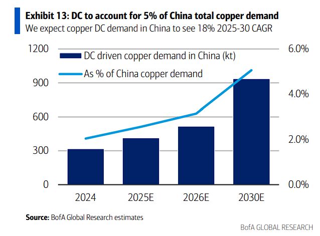 报告测算,到2030年,中国AI数据中心直接消耗的铜将达到约100万吨,占全国总需求的5-6%。与此同时,作为轻量化和导热的关键材料,铝的需求同样强劲,预计到2030年数据中心将带动695千吨的铝需求。
