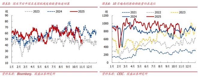 10月对美出口同比降幅可能仍大,与美国征收对华港务费等扰动有关。由于船舶调度需要时间,实际发船数量滞后集装箱预定量两周左右,Vizion数据显示,9月中旬至10月中旬中国至美国航线的集装箱预定量同比增速为-11.3%,对应10月我国对美出口仍偏弱;彭博数据显示,国庆节后中国对美集装箱船发船数量大幅回落,目前处在历史低位。