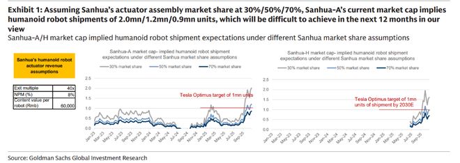 高盛的核心论点在于,市场对三花智控在人形机器人领域的估值已经“过高、过早”。根据高盛分析师Jacqueline Du的测算,三花智控A股当前市值所隐含的估值,相当于其在未来需对应90万至200万台人形机器人的出货量(假设三花在执行器总成中占据30%至70%的市场份额)。