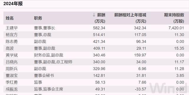 万得数据显示,2024年,董事长王建华薪酬最高,税前为582万元,其余高管多超过300万元,原总裁杨宜方薪酬514万元,现总裁高波薪酬409万元。王建华更多财富还是来自股权,其持有7420万股,为第二大股东。