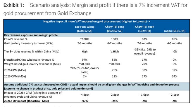 摩根士丹利的情景分析显示,在额外征收7%税收成本的假设下,不同珠宝商面临的冲击程度存在显著差异。