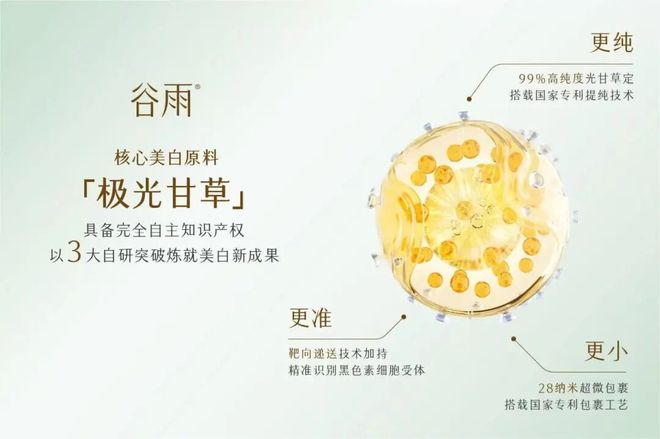 早在2007年,谷雨护肤实验室锁定“光甘草定”这一美白成分,彼时国际大牌仍沉迷于烟酰胺、VC等传统路径。针对烟酰胺成分刺激性强的痛点,谷雨旗下“光甘草定” 为核心的系列产品,主打 “无需建立耐受”,精准匹配敏感肌用户需求,完成关键认知绑定:“光甘草定=谷雨”。