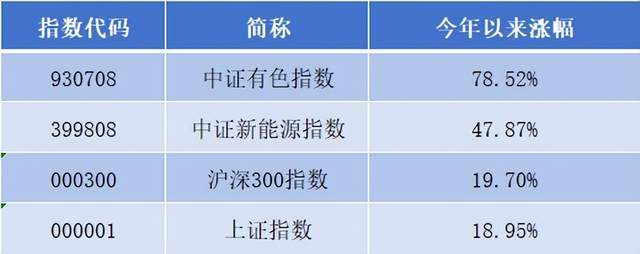 回来到资本市场,今年以来有色金属指数、新能源指数涨势喜人,领跑主要宽基指数,涨幅分别为78.52%、47.87%。