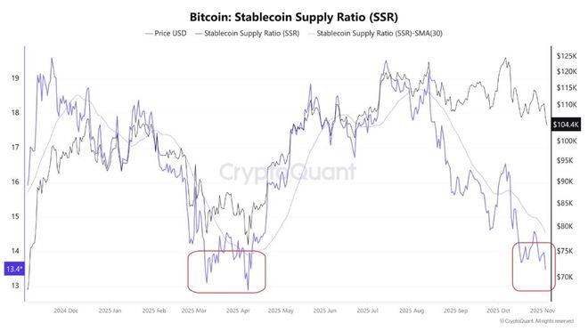 来自CryptoQuant的数据显示,稳定币供应比率(SSR)已回落至13-14的区间。从历史上看,这一水平曾多次标志着市场的流动性拐点——当稳定币余额相对增加时,意味着场外“购买力”正在积蓄。