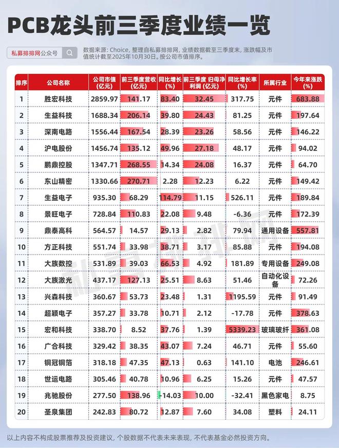 股价表现上来看,A股PCB前二十大市值龙头中,今年来涨幅在100%以上高达12只个股,今年来涨幅均值为199.26%。业绩方面来看,胜宏科技、生益科技、生益电子等头部厂商在2025年前三季度业绩普遍实现高速增长。
