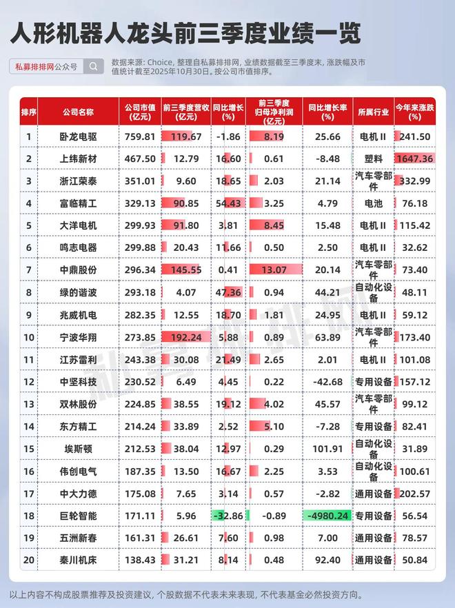 股价表现上来看,A股人形机器人前二十大市值龙头今年来涨幅均值为188.04%,今年来涨幅在100%以上有9只个股。业绩方面来看,卧龙电驱、浙江荣泰、绿的谐波等头部厂商在2025年前三季度业绩增速表现较为领先。