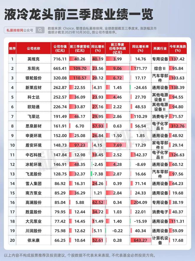 股价表现上来看,A股液冷前二十大市值龙头今年来涨幅均值为88.09%,今年来涨幅在100%以上有6只个股。业绩方面来看,英维克、银轮股份、飞荣达等头部厂商在2025年前三季度业绩增速表现较为领先。