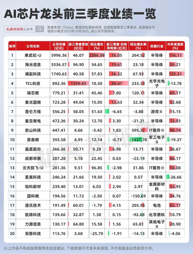 股价表现上来看,A股AI芯片前二十大市值龙头,今年来涨幅均值为42.95%,今年来涨幅在100%以上有2只个股,分别是寒武纪-U、澜起科技。业绩方面来看,寒武纪-U、瑞芯微、岩山科技等头部厂商在2025年前三季度业绩普遍实现高速增长。