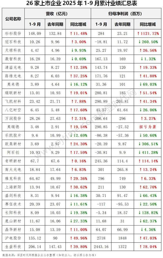 杉杉股份、雅克科技、有研新材、沪电股份、生益科技、万润股份等26企披露2025年第三季度业绩-新浪财经