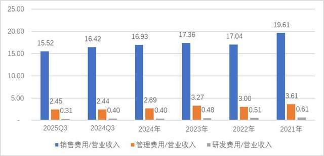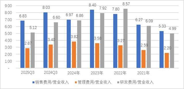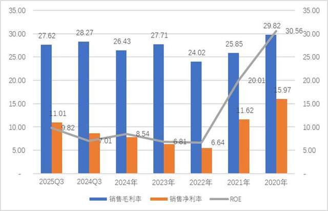 销售净利率的下滑一方面是与市场需求下滑下的账款策略有关,另一方面亦与营收下滑后,三项费率比反而上升有关。2025年三季报显示的数据相比去年同期,销售毛利率略有下降,但营运周期、应收账款、三费比等均有好转,销售净利率反而提升了2.4个百分点。