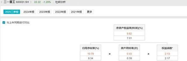 2022年以来,三一重工ROE介于6.64%-8.54%之间,2025年三季报显著好转,至9.82%。