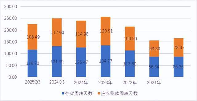与之相对应的是营运周期显著拉长,从2020年的164.82天至2024年240.45天,存货及应收账款周转天数拉长。