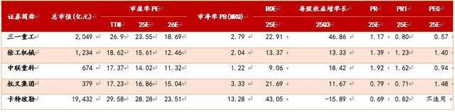截至11月3日,公司PE TTM 24.17倍,股息率 2.85%。选取徐工、中联、杭叉及卡特彼勒作为其可比公司,其PE TTM介于17.23-29.58倍,按25年 PE预测值介于16.86至28.28倍,卡特彼勒PE 值最高,与其高ROE相关。其次为三一重工,相比国内同业,享有龙头溢价。