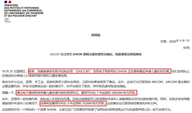 近 期, 法国消保 与反欺诈总局(DGCCRF)发文,已就希音在网上销售带有“儿童色情特征”的性玩偶一事,向司法部门举报。