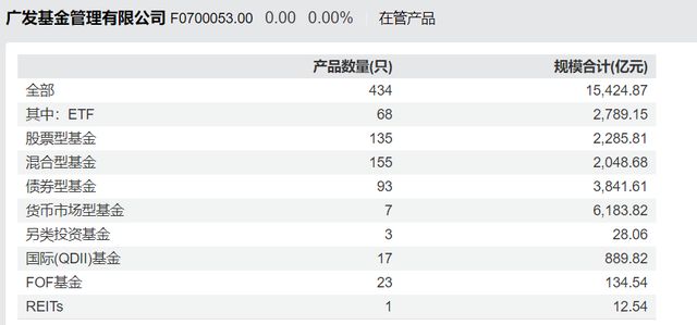 目前,广发基金共有434只基金,管理规模达1.54万亿元,较二季度末相比增长6.2%。其中货币型基金7只,股票型139只、混合型155只、债券型93只。