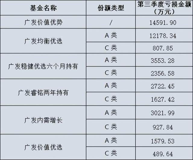 广发均衡优选混合A今年以来收益率为-10.16%,第三季度亏损1.22亿元,亏损排名位列第二。广发稳健优选六个月持有期混合A、C亏损金额分别为3553万元、2357万元;广发睿铭两年持有期混合A和C亏损2722万元、1627万元;广发内需增长A和C亏损3021.99万元和927.84万元,广发价值优选A和C分别亏损1579.53万元和489.64万元。