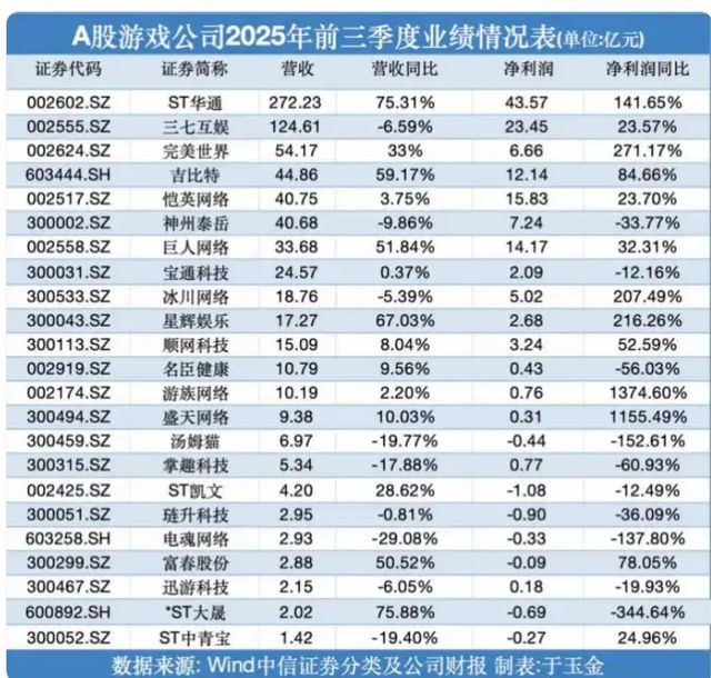 若不跟腾讯和网易对比,只看A股上市公司,目前戴帽的世纪华通(ST华通)仍然是一座难以逾越的“高山”,据Wind统计数据显示,2025年前三季度,世纪华通营收272.23亿,同比增长75.31%,净利润43.57,同比增长 141.65%。