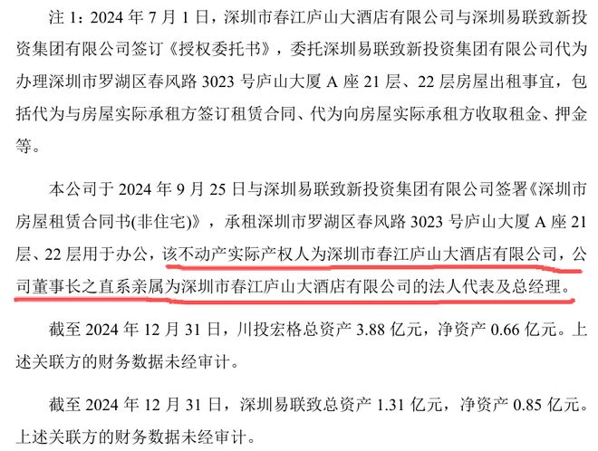 公告披露,上述房产实际产权人为深圳市春江庐山大酒店有限公司(简称“春江庐山大酒店”,原名“深圳春江企业公司”),而公司董事长林晓晴的直系亲属正是该公司的法人代表及总经理。