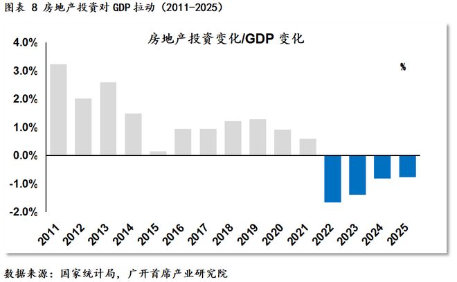 “十五五”时期,国内房地产市场总体仍将处于由筑底走向平稳运行的阶段,房地产市场本身运行趋稳并不等同于房企市场风险完全可控。“十五五”前半期,房地产市场下行仍然可能是拖累GDP增长的最主要因素。经测算,“十五五”时期,房地产投资平均每年跌幅为4.5%,假设GDP增速在4.5%左右,预计平均每年房地产投资对GDP的贡献率下降约6个百分点,拖累GDP增速0.25个百分点左右(见图8)。尽管拖累程度较“十四五”时期有所减轻,但长期对经济造成的负面影响不可小觑。在我国居民消费支出结构中,直接与住房相关的支出占比约四分之一,包括房产购置、日常租金、水电煤能源支出,另外还有与之相关的装潢建材、家电、家具等,而房地产市场的下行意味着居民相关消费支出的减少,进而拖累整体消费增长。从居民收入端来看,由于存量商品房仍有下行压力,房产作为普通居民最主要的非金融资产,长期的持续资产减值缩水将进一步影响居民日常的消费支出能力和消费偏好。预计“十五五”时期,房地产投资下行每年可能拖累固定资产投资约0.5个百分点,这对当下不到3%的固定资产投资增速而言,其拖累程度不言而喻。土地出让收入的减少对地方财力形成制约,进而直接减少地方基建投资。
