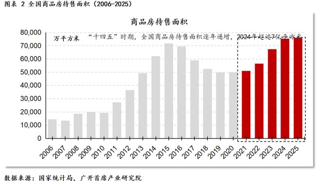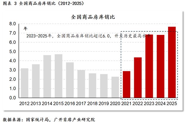 当前我国住房库存水平处于历史高位。“十四五”时期,全国商品房年均待售面积为6.54亿平方米,较“十三五”时期5.61亿平方米多增16.5%;同期,全国商品房库销比均值水平位5.5,较“十三五”时期2.9的水平多增92%,商品房库存积压程度为历史之最。“十四五”尾部时期库存水平则更高。截至2025年6月,全国商品房待售面积为7.6亿平方米(见图2),较2020年末净增2.6亿平方米,累计增加52%;商品房库销比为7.7(见图3),较2020年末2.3的库销比水平净增5.4,大约多增2.5倍。商品房库销比和存量待售面积两项指标均处于历史最高水平区间,表明全国范围内,商品房供应过剩状况较为严重,需要一个较长时期才能得到消化。