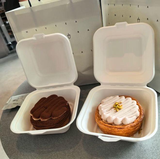 另一种更贵的是喜茶主推的AOP可颂塔,按照口味,一个的价格在25元到35元不等。最贵的是AOP提拉米苏可颂挞,内陷分上下两层:下层是奶盖质地流芯,上层是手指饼干、奶油、提拉米苏粉,外层则是类似可颂的酥脆挞壳,一个挞就是一道古今中西相交杂的融合菜。