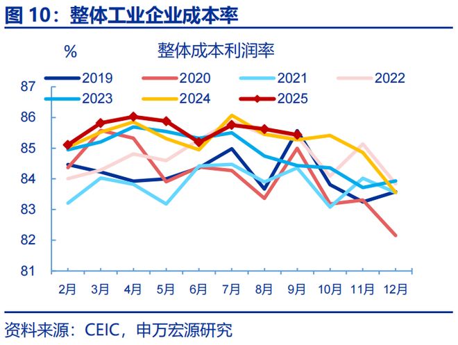 利润:9月剔除低基数因素后,工业企业利润弱于往年,且目前成本率仍处历史高位。低基数下,9月工业企业利润同比回升2.6pct至22.5%。但两年复合看,9月利润增速回落5.3pct至-5.9%;同时利润环比仅1.1%、明显弱于往年同期(11.3%)。从影响因素看,利润同比延续上行更多是费用率等短期指标对利润同比的拉动明显回升,边际上行9.5pct至11.6%。但影响利润增速的中长期因素,如成本压力仍在增加,9月整体成本率为85.4%、对利润同比的拉动较前月回落0.3pct至-3.6%。结构上,冶金链、消费链的成本率均在历史高位。因此,后续企业利润修复的持续性有待进一步跟踪。