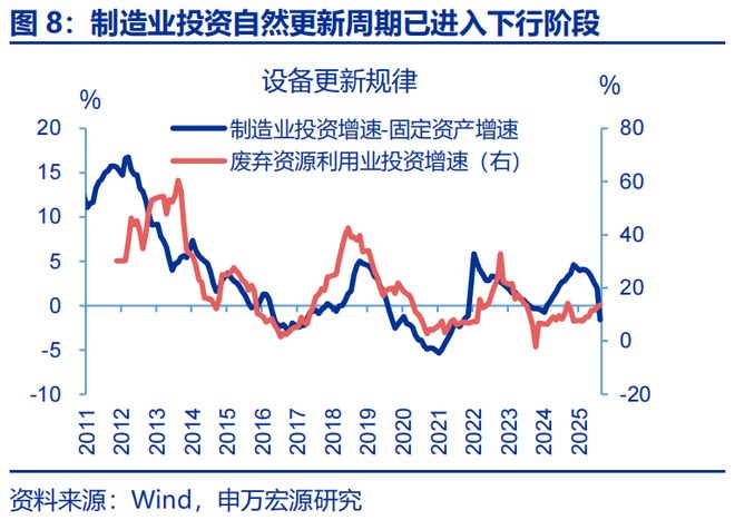 需求:需求压力或更多体现在制造业领域,主要表现为企业加快清缴欠款,对投资产生额外拖累。近两年部分企业以欠款形式增加投资,本轮化债除聚焦地方政府外,也要求企业加快清缴欠款;由于当前企业盈利偏弱,企业或将用于投资的资金清缴欠款,导致固定投资回落。2025年6月来应收账款增速明显回落,与固定资产投资回落的时点基本一致,也与2019年清缴中小企业欠款时类似。9月应收账款增速进一步降至5.7%,短期来看清缴欠款或仍对制造业投资产生拖累。此外,去年来,制造业投资表现强劲并非源于政策驱动,更多是设备处于自然更新的上行周期;但下半年来,自然周期进入退坡阶段;制造业投资较固定资产增速的差值在达阶段性顶点后持续回落。