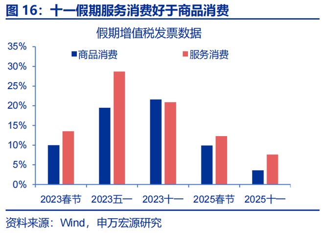 消费:“双十一”提前或短暂支撑商品零售;同时服务领域维持较强的增长韧性,预计社零在本月出现暂时性反弹。在“双十一”促销进一步前置叠加汽车补贴政策调整预期影响下,10月社零或出现反弹(3.4%),推动部分商品消费从11月转移至10月。但随着促销高峰回落,及去年高基数、居民需求“透支”等影响下,商品零售后续或呈弱势表现。而在中秋国庆长假刺激及居民出行维持高位带动下,服务消费需求得到更多释放;税务总局增值税发票数据显示,假期服务消费同比为7.6%、高于商品消费(3.6%),后续消费的增长弹性或更多在服务领域。