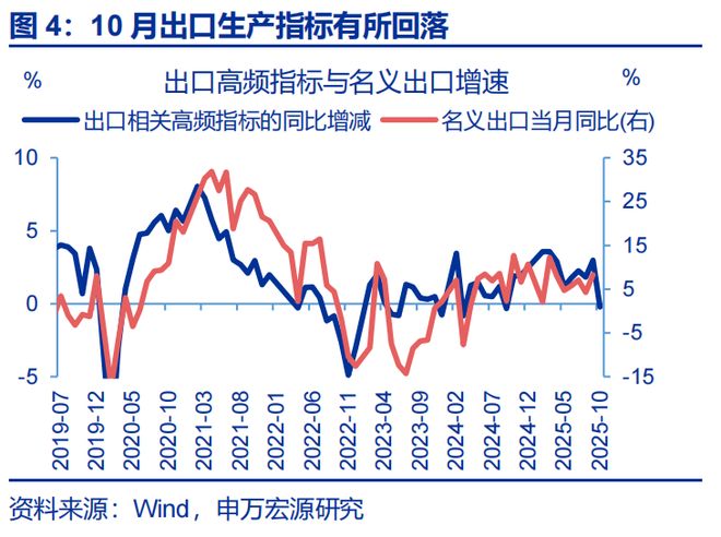 出口:10月中美关税一度再生波折,“抢出口”或再支撑10月出口。10月10日美国威胁自11月起对中国所有商品加征100%关税,预期关税政策加码或再度引发对美“抢出口”。考虑到企业发货到报关出口存在时滞,10月最后一周港口外贸货运量出现冲高现象,同比较前周上行18pct至20%,或反映“抢出口”现象。并且出口链生产只衡量当期生产、本月更多受到高库存约束;而港口外贸货运量还包括存货用于出口。当期生产回落,但存货仍可用于出口,因此10月港口外贸货运量并不弱。加之9月加工贸易进口同比回升(+6.6pct至12%),10月出口同比预计维持韧性(7%)。
