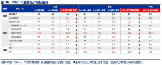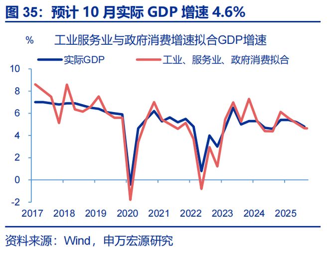 总结:政策已在积极对冲经济的内生压力下,数据拟合后的10月实际GDP或为4.6%、仍保持较高增速。10月以来,“高库存”等短期因素的扰动,或令供给侧对经济景气的约束较大;同时企业加快清偿欠款等影响下,需求侧也面临一定程度的下行风险。但目前政策已在积极落地,近期中央财政从地方政府债务结存限额中安排5000亿元下达地方,政策性金融工具加快落地,化债对投资的挤出效应或趋弱;同时中美关税政策缓和,出口或仍保持高景气,预计短期内经济修复或迎来拐点。生产法下,通过数据拟合来看,10月GDP实际同比或在4.6%左右。