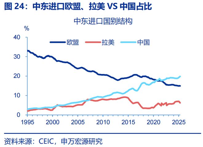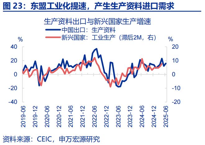 10月底中美“关税政策”迎来缓和,加之我国在新兴份额持续提升下,后续出口可能仍延续高景气度。中美关税出现进一步缓和,芬太尼关税降低10%基本对应支撑当月出口同比1个百分点左右(关税1.0时期、今年4月以来出口弹性均在1倍左右),加之欧美发达国家仍处于补库周期,预计后续对发达经济体出口仍有空间。与此同时,新兴国家工业化、城镇化提速带来增量的生产资料进口需求,以及我国在新兴市场份额持续提升等逻辑,我国中间品、资本品出口持续走强,预计后续出口仍保持高景气。