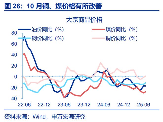 PPI:虽然中下游产能利用率持续偏低,但10月以来上游大宗明显涨价,或推动PPI温和恢复。大宗价格方面,虽然钢价出现较大幅度回落(环比-1.4%),但国内铜价、煤价延续上涨(环比分别7.5%、5.5%),同时国际油价领先我国PPI半个月,9月中旬-10月中旬油价环比降幅收窄至-0.2%,预计大宗价格对PPI贡献仍在持续。但反内卷落地滞后下,中下游产能过剩问题仍较明显,令中下游价格修复斜率偏慢,因而10月PPI修复程度有限、预计可能回升至-2.1%左右。