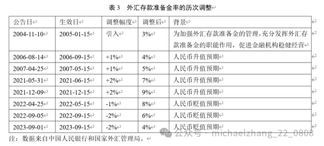 2004年11月10日,中国人民银行决定将金融机构外汇存款准备金率统一调整为3%。这是中国首次将外汇存款准备金率的覆盖范围扩展到所有经营外汇存款业务金融机构,标志着外汇存款准备金率作为货币政策工具开始发挥相应职能作用。其后,中央银行分别于2006年8月14日和2007年4月25日上调金融机构外汇存款准备金率。此后十余年,中国人民银行未调整过外汇存款准备金率,始终维持在5%。直到2021年,中国人民银行两次上调外汇存款准备金率。而在2022年和2023年,中央银行先后三次下调外汇存款准备金率。