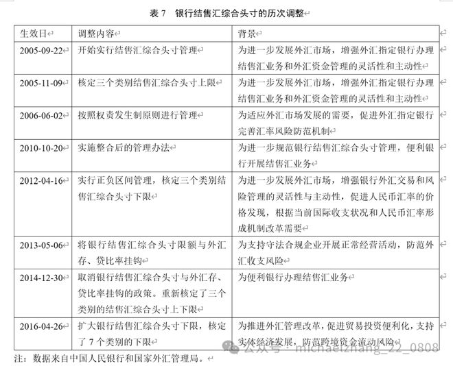 在刚采用银行结售汇综合头寸管理的2005年,银行结售汇综合头寸的下限为0,上限按照上一年度结售汇业务量分为500万美元、1000万美元和2000万美元三个等级。随着外汇市场业务的发展,中国先后扩大银行结售汇综合头寸的上限和下限。上下限的扩大有助于外汇指定银行完善汇率风险防范机制,增强银行外汇交易和风险管理的灵活性与主动性,促进人民币汇率的价格发现。