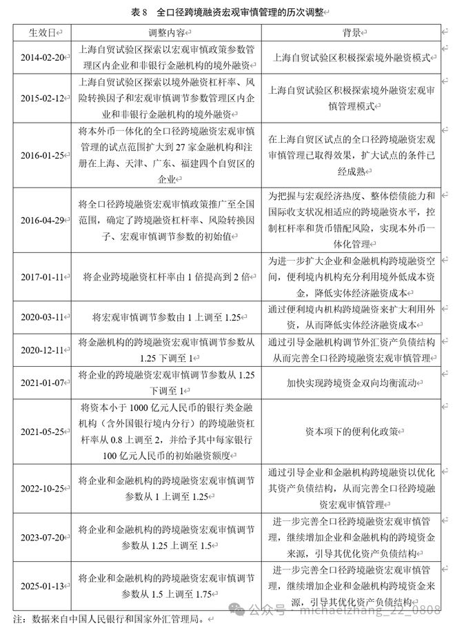 2017年1月11日开始,中国人民银行先后通过企业和金融机构的跨境融资杠杆率、宏观审慎调节参数等来宏观调节全口径跨境融资。
