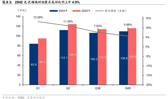 尽管市场担忧下半年需求下滑,但 SMM 数据显示,6-7 月光伏组件产量分别为 46.3GW、47.1GW,未出现大幅下降。测算显示,2025 年下半年光伏领域对铝需求环比将上升 4.9%,全年同比增速达 7.1%,成为需求增长的重要支撑。