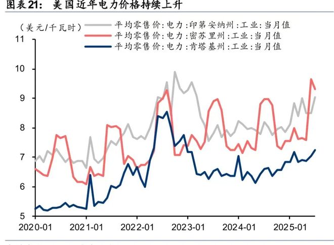 又比如, 美国受电力成本高企与设备老化影响,2020 年后电解铝产量连续五年下降,2022-2024 年同比分别下降 3.7%、10.7%、13.8%。尽管 2025 年加征关税带动铝溢价攀升,但 Holly 项目仅能重启部分产线,2025-2027 年新增产量合计仅 7.2 万吨,复产进度显著低于预期。