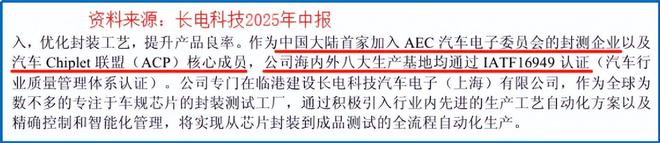 公司是中国大陆首家加入AEC汽车电子委员会的封测企业,其海内外八大生产基地也均通过了车规级质量认证,其技术和质量体系获得了汽车行业严格的准入认可。