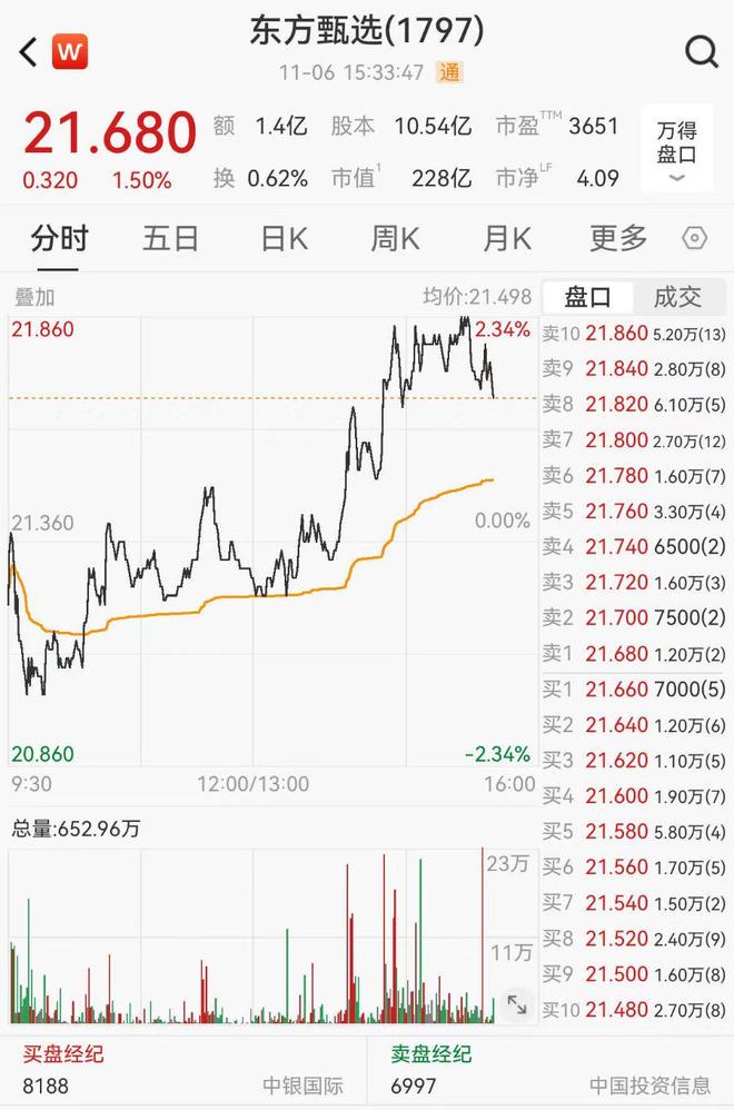 截至11月6日15:33,东方甄选(1797.HK)涨1.5%,报21.68港元/股,总市值228亿港元。