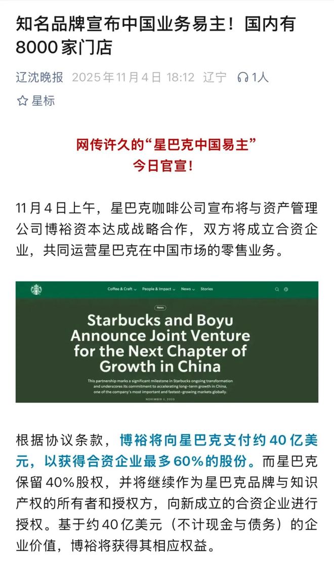 11月4日,星巴克中国官宣易主,新的合作方是博裕资本。按理说,这是本周最受关注的一桩消费资本事件。然而,在传媒见闻核对交易细节时,却发现了一个罕见的“集体乌龙”——不少主流媒体,都把星巴克中国的“卖身价”报错了。