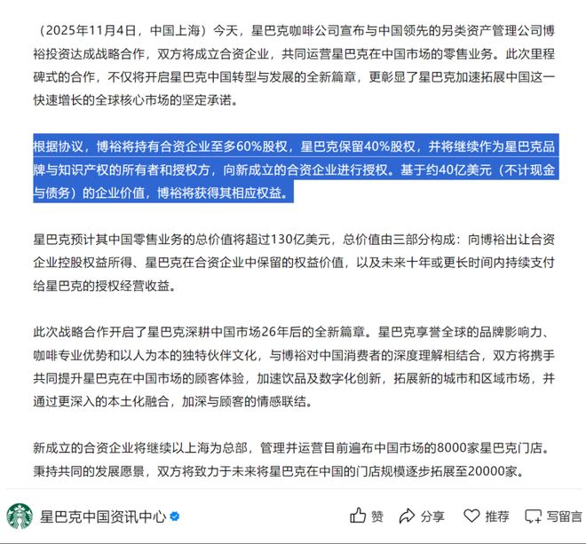 根据星巴克中国官方通告,星巴克与博裕资本将共同成立合资企业运营中国市场,合资公司整体估值为40亿美元,其中博裕资本持股60%。换句话说,星巴克此次出让的交易金额是24亿美元,而非40亿美元。